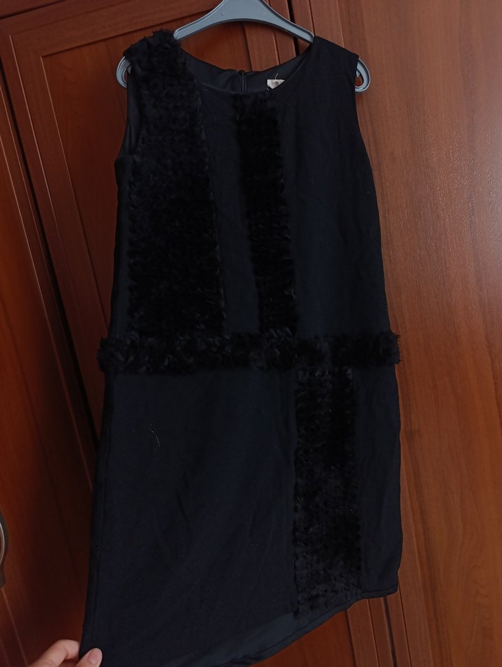 Kolsuz, kürk detaylı, yuvarlak yakalı siyah midi elbise, bol kesim ve gotik tarzda, ofis kullanımı için uygun.