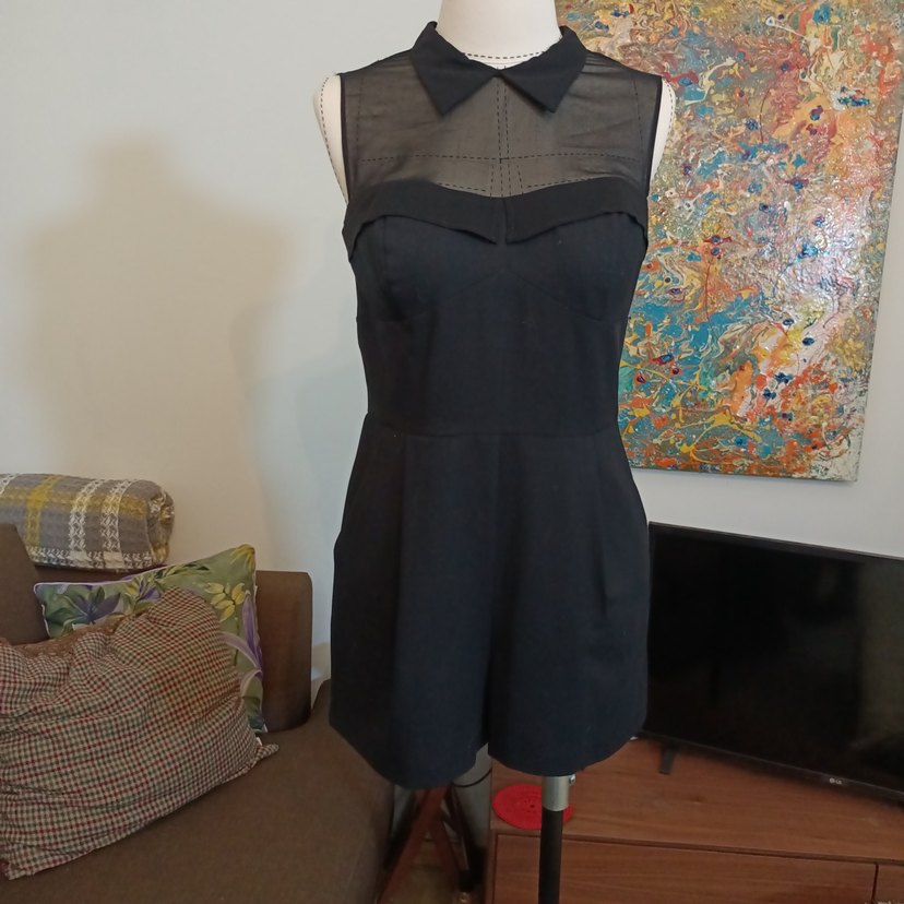 Kolsuz, yakalı ,cepli ve kemerli siyah midi tulum, üst kısmı tül diğer kisimlar kumaş sentetik kumaştan ve ofis ortamına uygun gotik tarzda tasarlanmıştır.