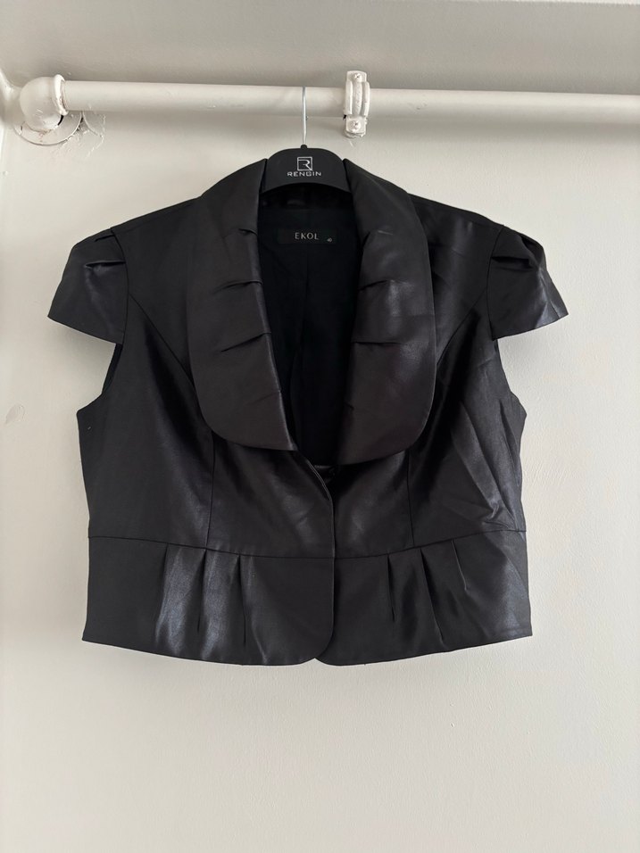 Kolsuz, siyah deri mini ceket, keskin yakalı ve kemerli, ofis için şık ve cesur bir tercih.