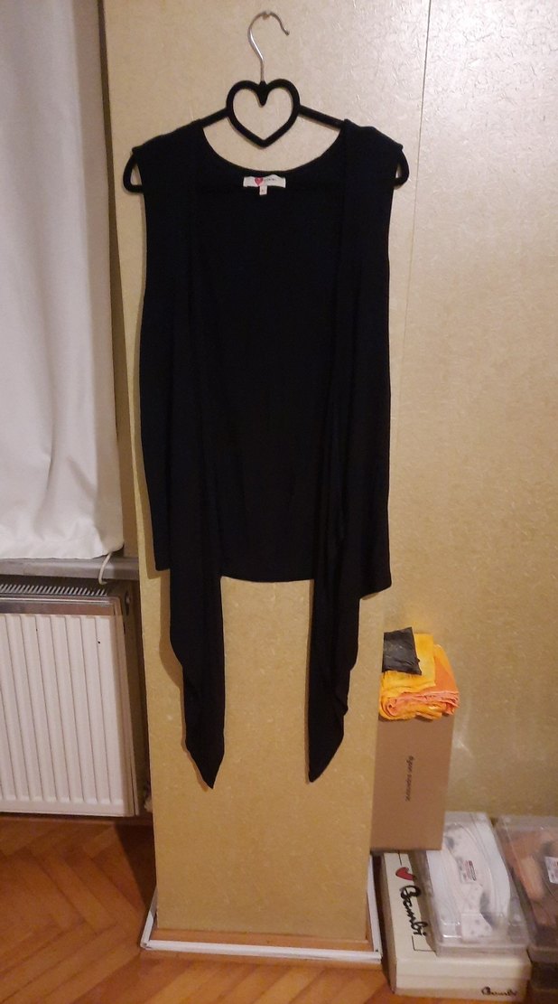 Uzun kolsuz yelek. Bol kesim ve siyah renkte, ofis için minimalist gotik tarzda yumuşak penye kumaştan üretilmiştir.