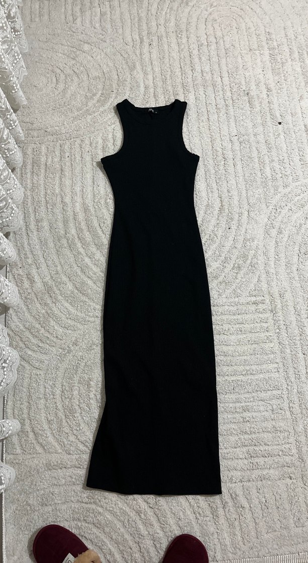 Kolsuz, V yaka, siyah uzun elbise. Sıkı kesim ve kürk detaylı, sentetik kumaştan minimal gotik tarzda. 40-45 kilo arası tercih etsin