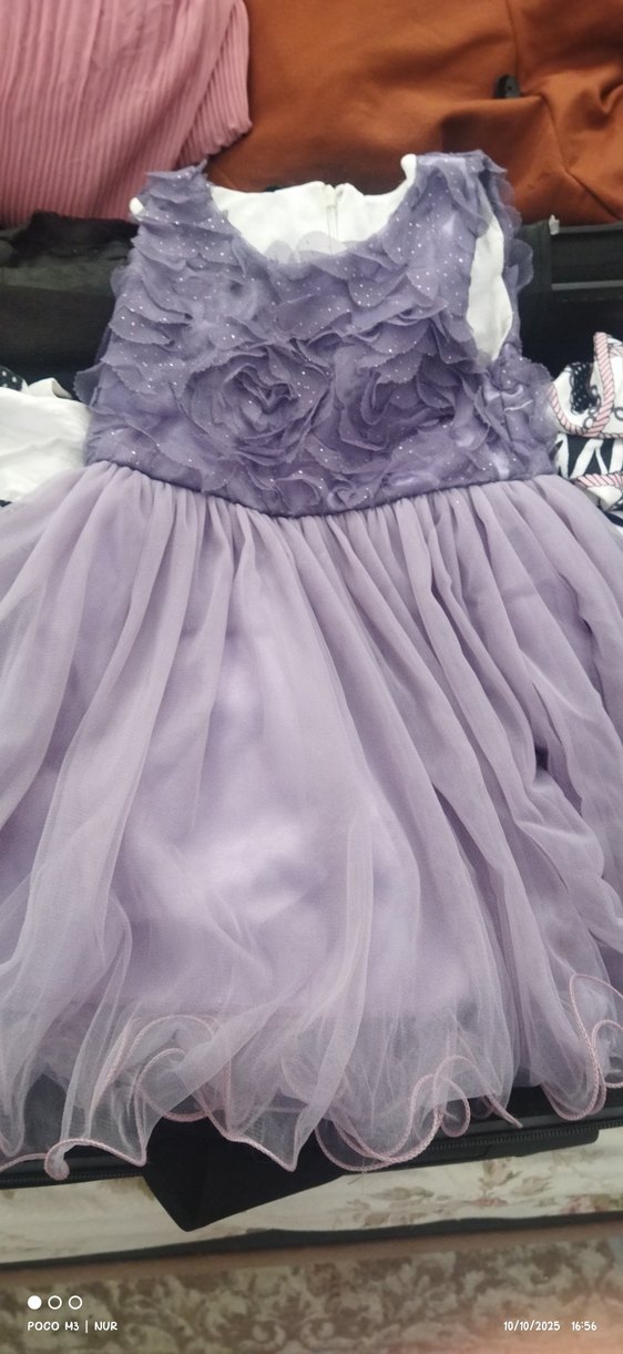 Kolsuz, straplez yaka, mor renkli kız elbisesi, gövdesinde fırfır detayları bulunur. Yumuşak sentetik kumaştan yapılmış, şık ve dökümlü bir etek kısmı vardır.