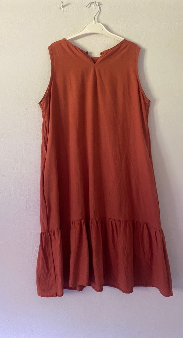 Kolsuz, V yakalı, keten kumaştan yapılmış kırmızı midi elbise. Fırfırlı eteği ve bol kesimiyle bohem tarzda, günlük kullanıma uygun.