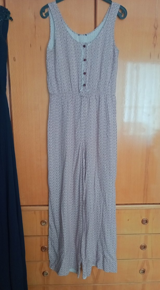 önden düğmeli,beli lastikli uzun tulum.Pantolon kısmı bol ve çok rahat.Kumaş dökümlü ve minik desenli.Cok az kullandım.Vena marka.