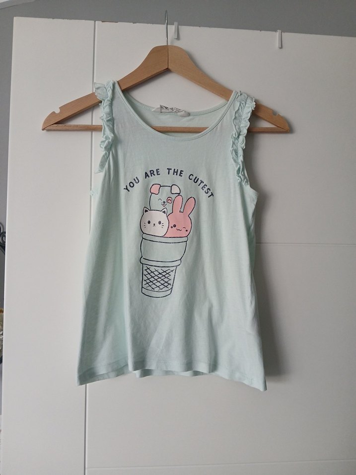 Turkuaz renkli, kolsuz kız tişörtü, bol kesim ve fırfırlı kollara sahiptir. Yuvarlak yaka ve 'You are the cutest' yazılı sevimli baskı içerir. Pamuk kumaştan üretilmiştir.