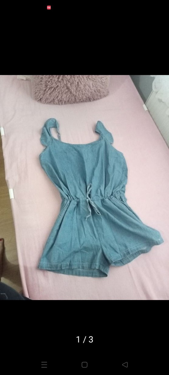 Kolsuz, turkuaz renkli denim kız tulumu, bol kesim ve ayarlanabilir bel ile bohem tarzda, pastel tonlarda.