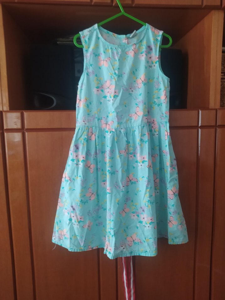 Kolsuz, turkuaz renkli kız çocuk elbisesi, bol kesim ve fırfır detaylı, pastel tonlarda batik desenli, askısız yakalı.