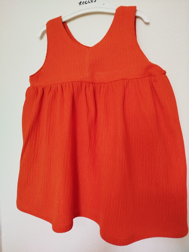 Kolsuz turuncu kız elbisesi, V yaka ve bol kesimdir. Fırfır detayı ve renkli bohem tarzıyla dikkat çeker. Bürümcük kumaş yaz için uygundur. Özel dikimdir.