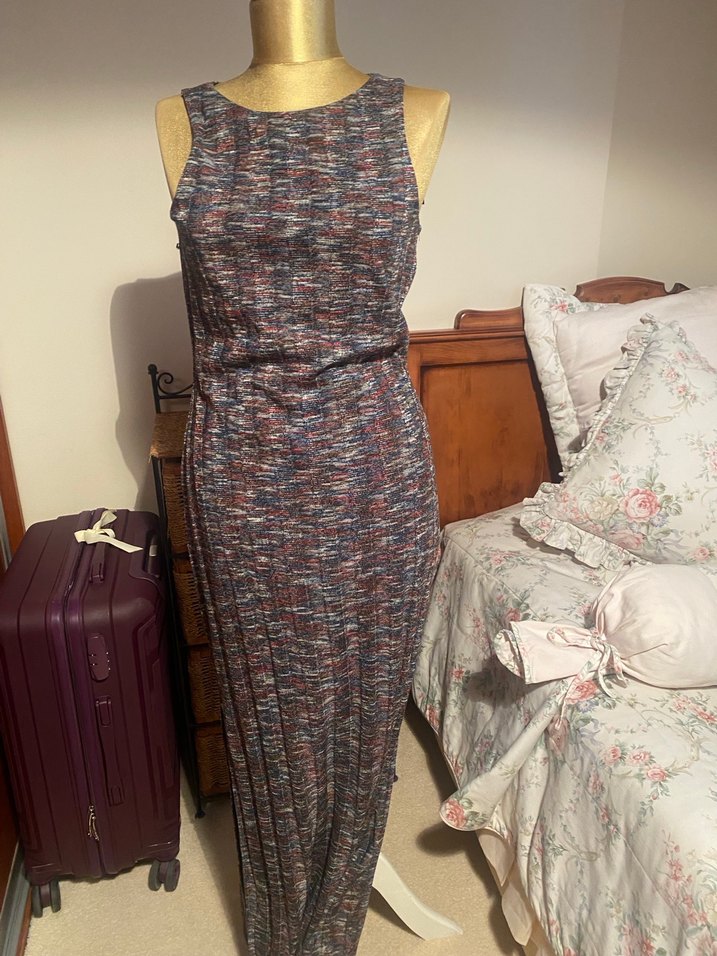 Bu dar kesim uzun elbise, yüksek yakalı ve kolsuz tasarımı ile piliseli dokunuşa sahip. Çok renkli batik desen, vintage bohem yırtmaçlı, boy 148 cm, etiketlidir