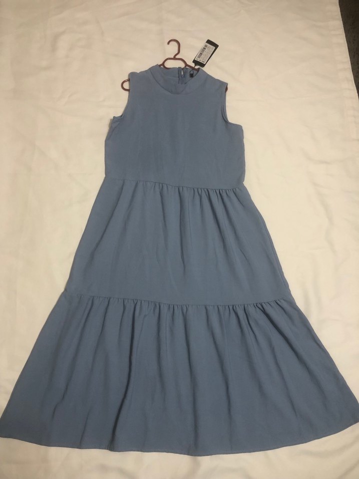 Yumuşak keten kumaştan, kolsuz uzun elbise. Yüksek yakalı ve fırfır detaylı, salaş kesim, düz mavi renkte, günlük kullanıma uygun.