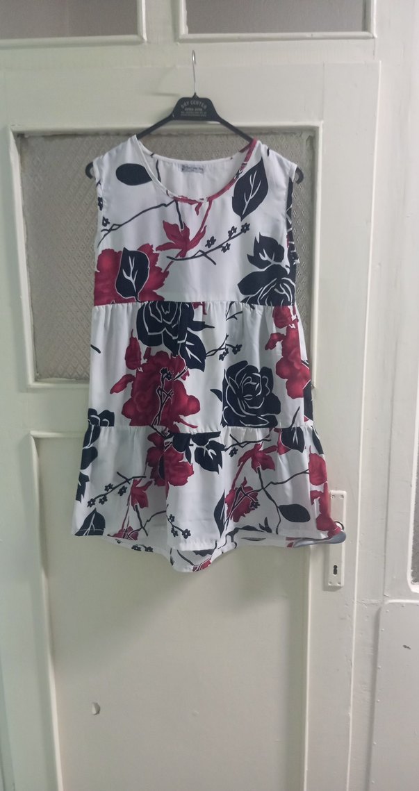 Çiçek desenli, kolsuz, V yakalı hamile mini elbise. Rahat kesimli, fırfır detaylı, yumuşak sentetik kumaştan günlük kullanım için uygun...(15) İki kol arası: 44 cm Elbise Boyu: 75 cm Ürünü satın alarak DMD kas hastası Turan Ünal'ın tedavisine katkı sağlamış olacaksınız...