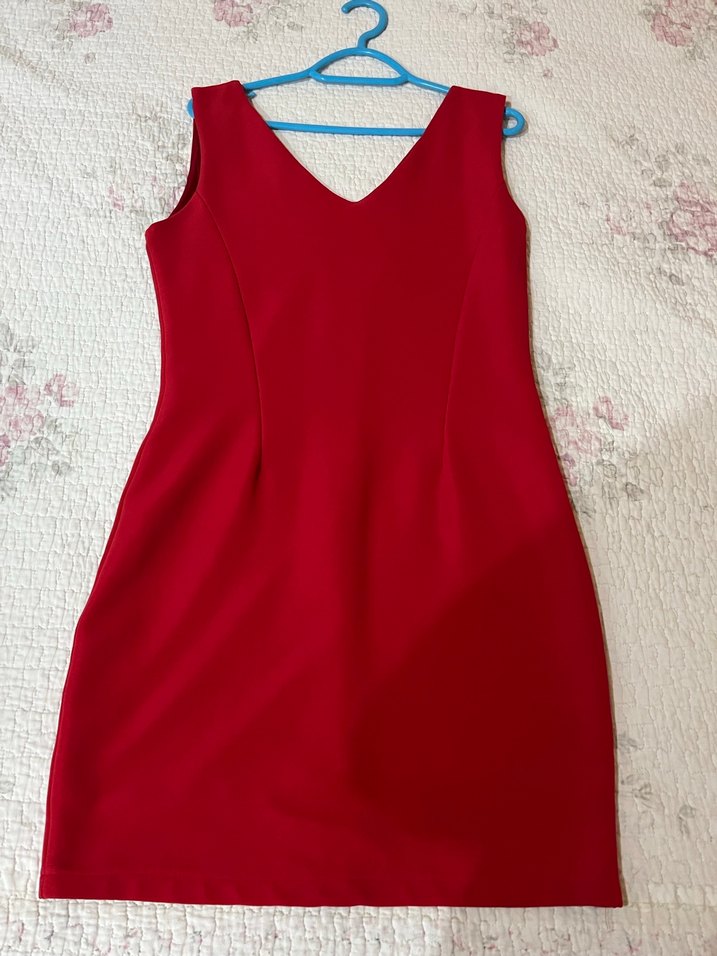 V yaka ve kolsuz tasarıma sahip, sentetik kumaştan yapılmış kırmızı, fitted midi elbise. Günlük kullanım için uygun, drapeli detaylı.