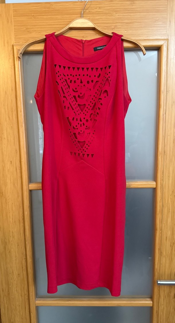 Kolsuz, V yaka ve desenli dantel detaylı kırmızı uzun abiye elbise. Bohem tarzıyla romantik akşamlar için uygundur.