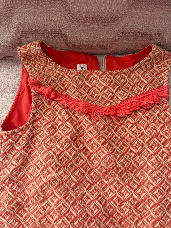 Kolsuz, V yakalı ve fırfır detaylı kız çocuk elbisesi. Kırmızı renkli, bohem tarzda baskılı ve vücuda oturan kesimde.