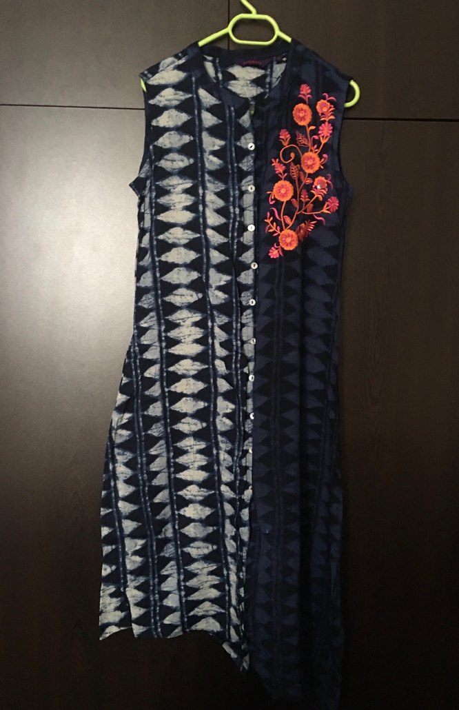 Lacivert desenli kolsuz elbise etek kısmı simetrik kesimdir hiç giyilmemiştir.