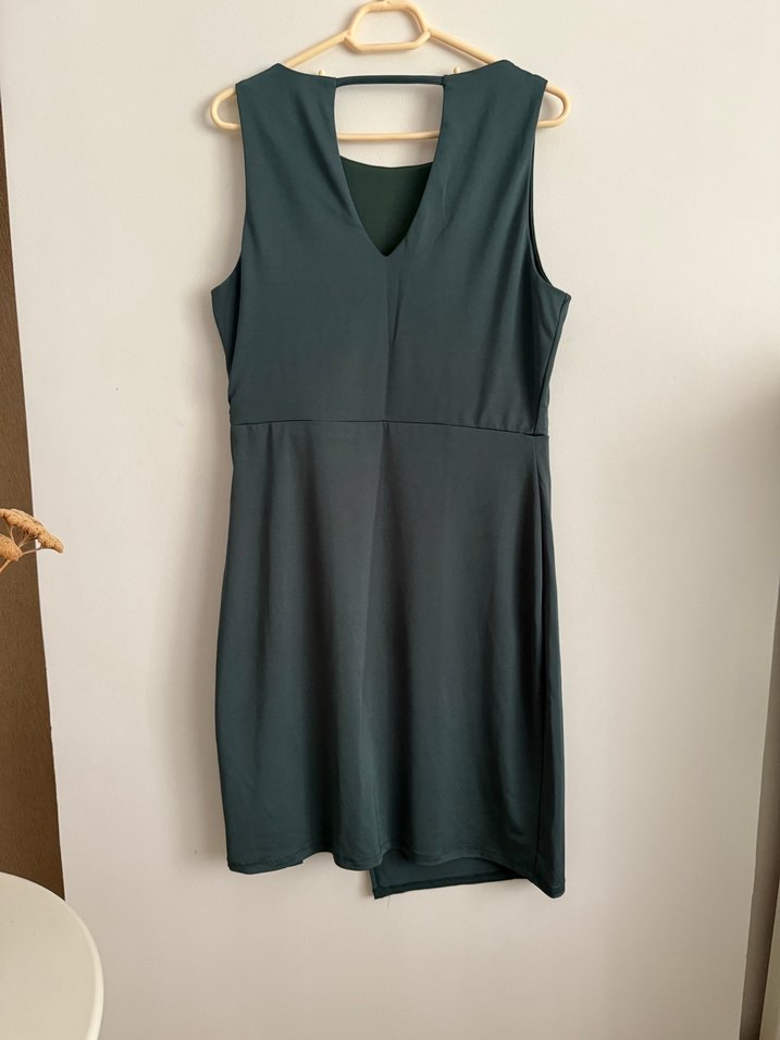 Kolsuz, V yaka ve drapeli tasarıma sahip, koyu yeşil midi elbise. Minimalist ve çağdaş tarzda, yumuşak sentetik kumaştan üretilmiştir.