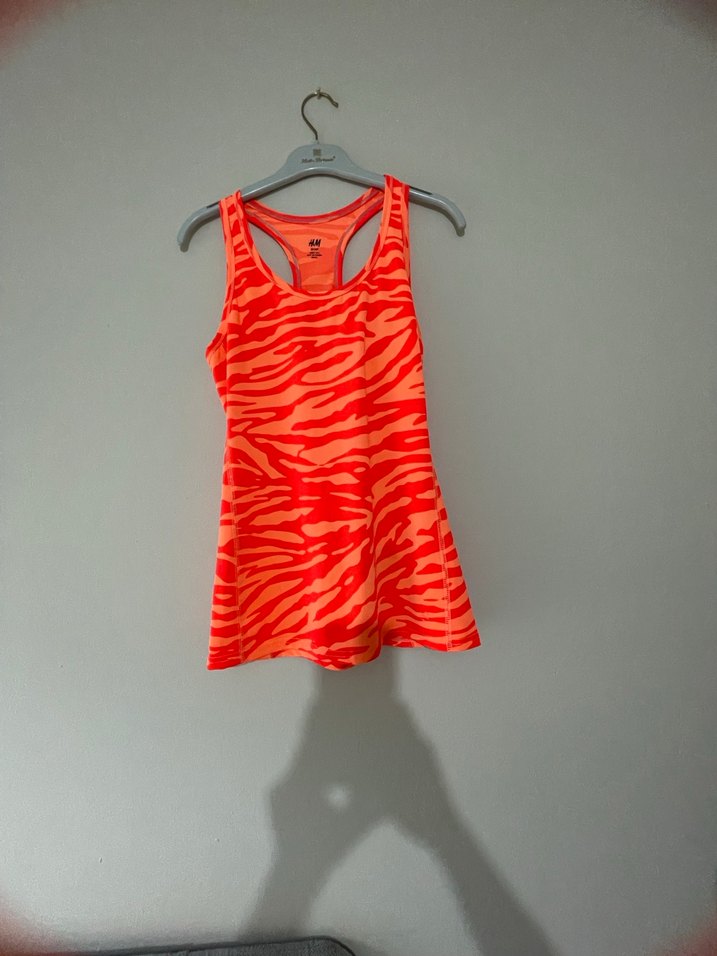 Kolsuz, V yakalı bu atlet, canlı turuncu tie-dye desenli, pilili ve kısa mini boyda, sentetik kumaştan üretilmiştir. Spor ve sokak stili için uygundur.