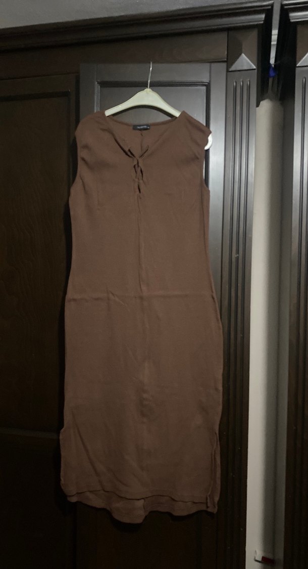 Kolsuz, V yakalı, bol kesim uzun keten elbise. Minimalist, desensiz ve koyu bej tonunda günlük kullanıma uygun, zahmetsiz şıklık sunar.