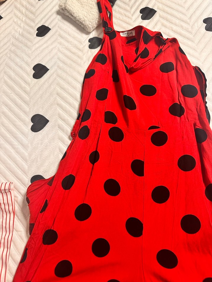 Koyu kırmızı üzerine siyah puantiyeli, kolsuz ve V yakalı, drapeli . Yumuşak sentetik kumaştan, bohem ve retro Paris tarzını yansıtır. Günlük kullanım için uygun.