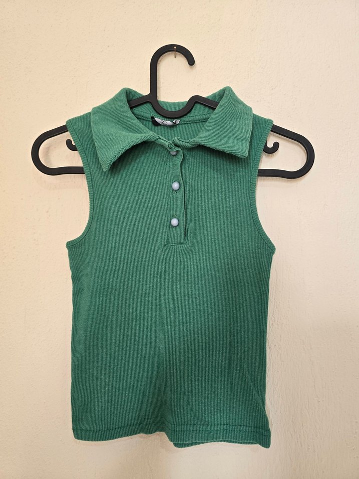 Kolsuz, düğmeli önü ve yakalı, yumuşak ve sıcak kumaştan yapılmış yeşil polo tişörtü. Trendy günlük kullanım için uygun.