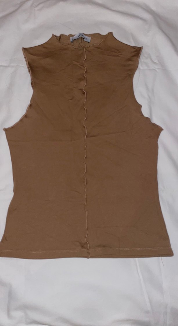 Kolsuz, yüksek yakalı kadın atlet. Düz ve desen içermeyen tasarımı günlük kullanım için uygun, minimalist sokak stilinde.
