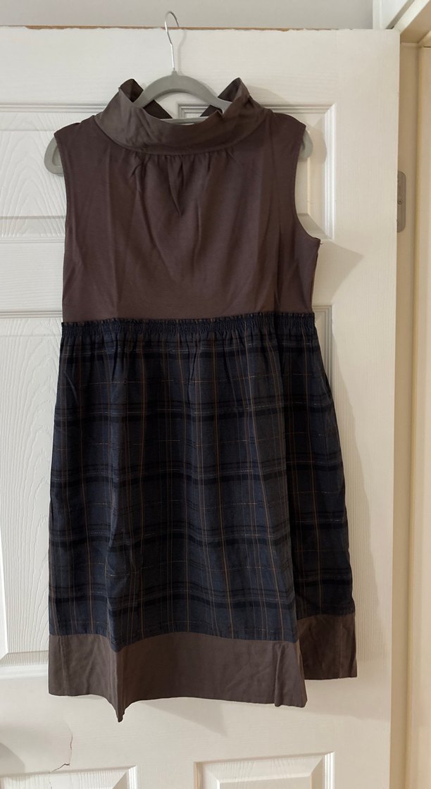 Kolsuz, yüksek yakalı ve bol kesimli hamile elbisesi. Koyu kahverengi üst kısmı ve ekose desenli etek kısmıyla rahat ve günlük kullanıma uygun.