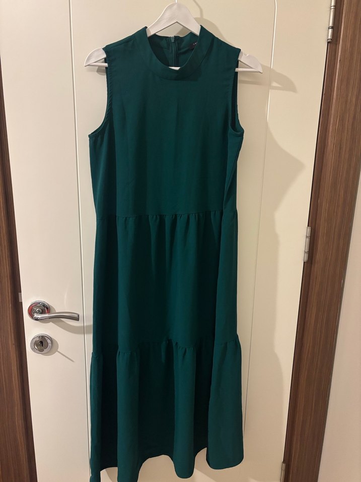 Koyu yeşil renkte, kolsuz, yüksek yakalı ve fırfır detaylı uzun elbise. Sentetik kumaştan, rahat kesimli ve minimalist tarzda.