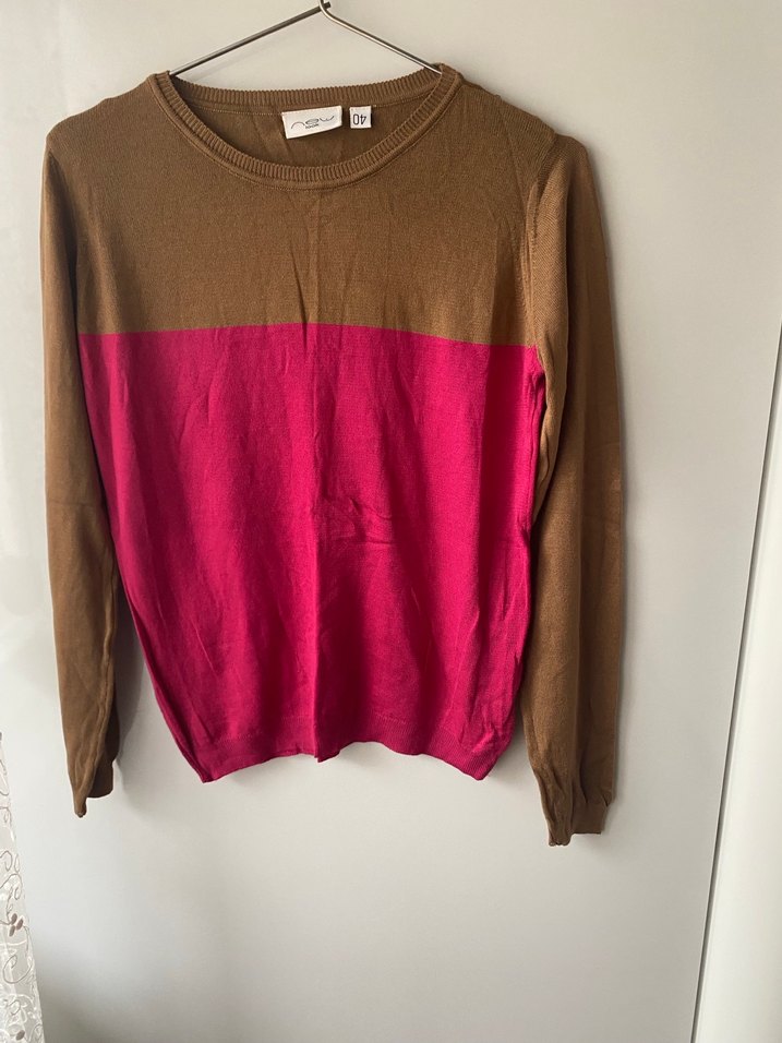 Kadınlar için yuvarlak yaka ve uzun kollu, bol kesim renk bloklu triko kazak. Kahverengi ve pembe tonlarında, midi boyda, gündelik kullanıma uygun.