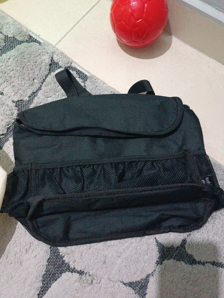 Ayarlanabilir askılı, çok bölmeli siyah bebek çantası. Dayanıklı kumaştan üretilmiştir ve örgü ceplere sahiptir. içi termoslu, sıcak ve soğuk tutma özelliğine sahip