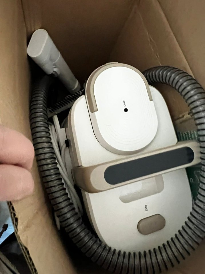 Beyaz ve gri renkte, esnek hortumlu ve çeşitli başlıkları olan kompakt elektrikli süpürge.