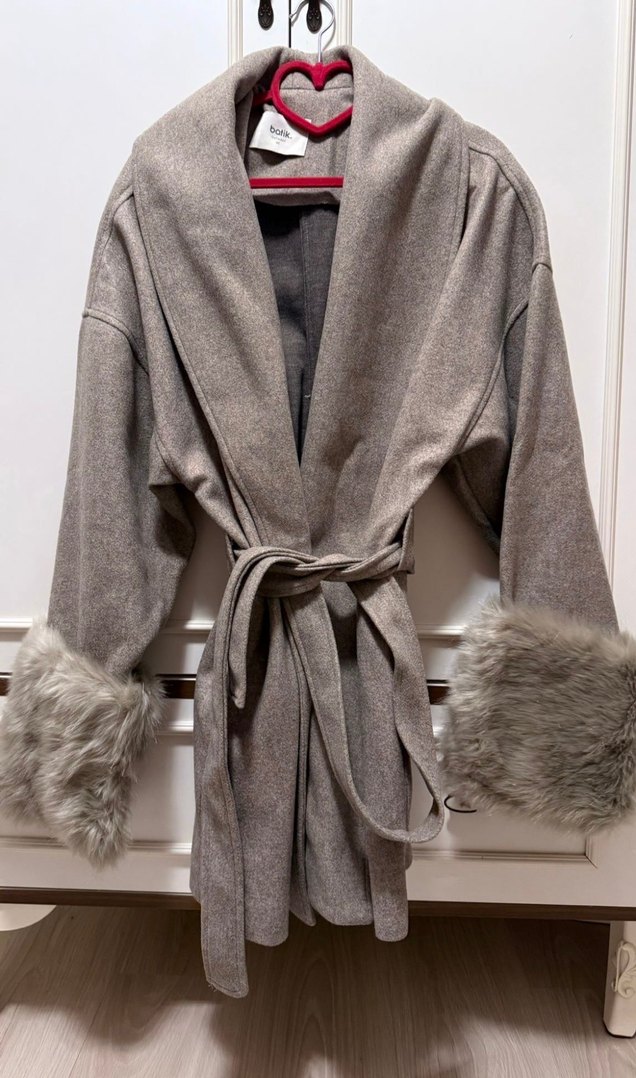 Krem renkte, yün kumaştan midi uzunlukta, bol kesim kadın kaban. Uzun kollarda kürk detayları ve klasik yakasıyla ofis için uygundur.