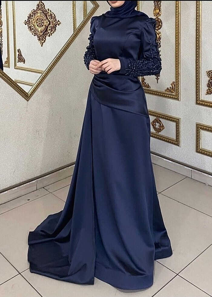 Kolu taş detaylı lacivert saten abiye