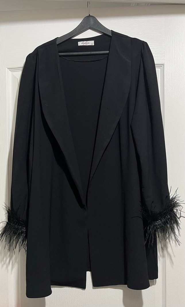 O kadar şık bir blazer ki ,çok severek kullandım ,ayrıca siyah kuşağıda mevcut . Ceket boyu :90 cm