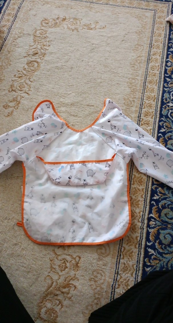 Uzun kollu, pastel renkli hayvan desenlerine sahip beyaz bebek önlüğü, turuncu kenarlık detaylıdır.