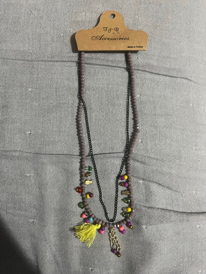 Renkli boncuklar ve sarı püskül detaylı, bağlama desenli uzun bohem kolye. Marka: MAccassories.