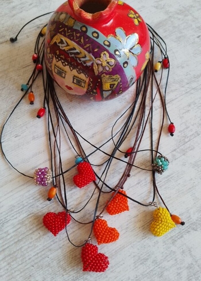Kolye Kalp ve top kolyeler Kum ve kristal boncuk ile yapilmistir. Tane: 100 tl 8 adeti: 300tl