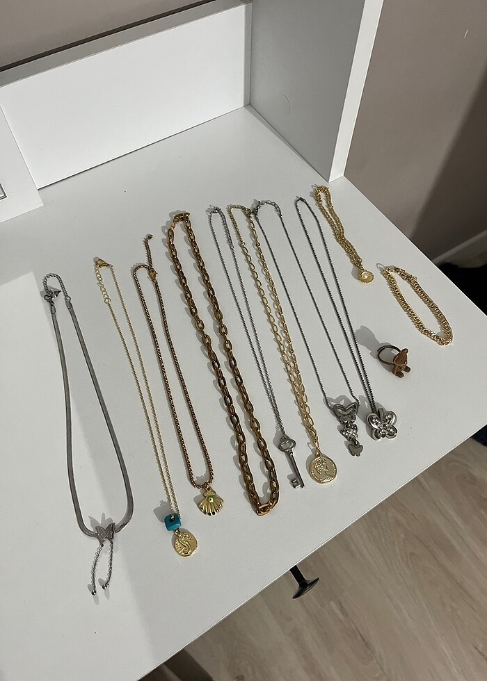 En solda ki italyan zinciri çeliktir diğerleri çelik değildir ilgileniyorsanız fiyat sorun en sağda ki iki kelebekli kolyelerin taşları düşmüştür