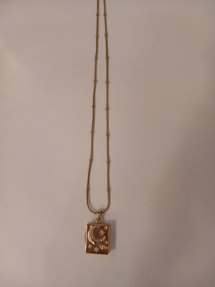 Ay ve yıldız figürlü dikdörtgen kolye ucu ve boncuk detaylı zincir ile altın renkli, parlak yüzeyli bohem tarzı kolye. Günlük kullanıma uygun.
