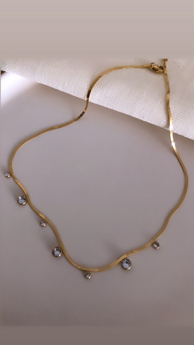 Gold İtalyan Yassı zincir ve küçük kristal detaylara sahip midi uzunlukta,çağdaş ve klasik şıklığı bir arada sunan çelik kolye. ✨