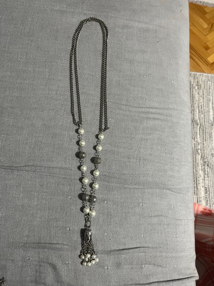 Günlük kullanıma uygun, beyaz yılan desenli boncuklar ve detaylı uzun gri zincirli bohem tarzda kolye.