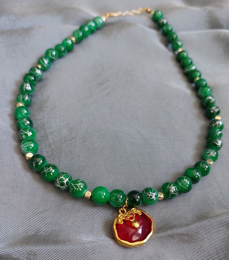 Ürün yeşil cam boncuklardan ve metal altın rengi kaplaması kırmızı kolye ucu ile tasarlanmıştır.