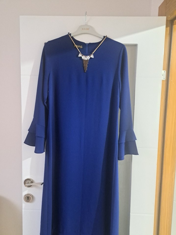 Zincir detaylı, uzun fırfır detay kollu ve yuvarlak yaka mavi uzun elbise. Parlak dokusu ve salaş kesimiyle minimalist şıklık sunar, özel günleriniz için uygundur.