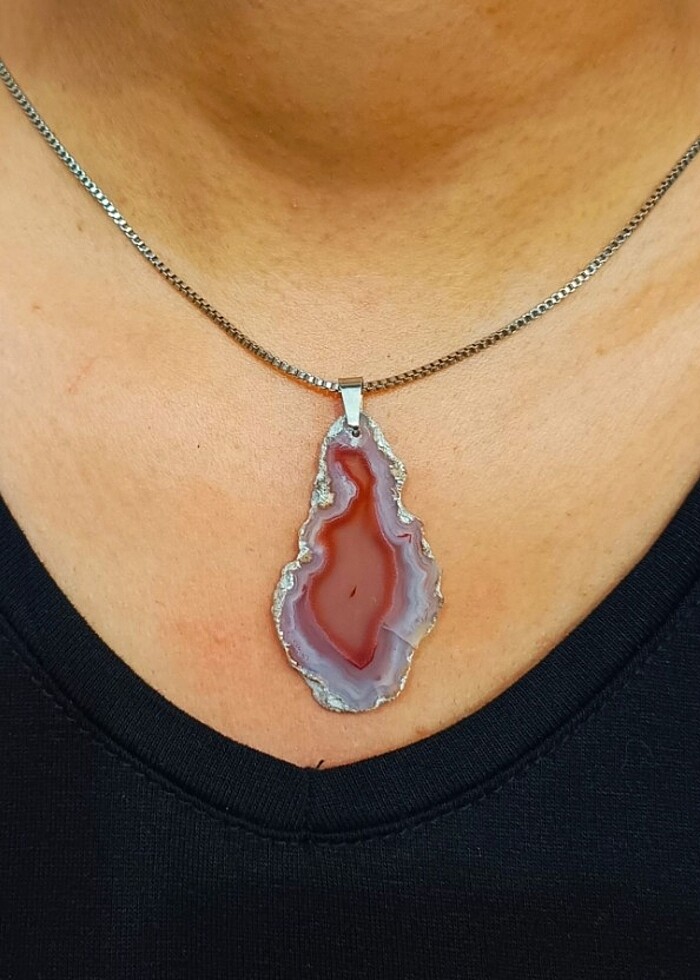 şeritli akik doğaltaş kolye . beyaz kaplama çelik zincir