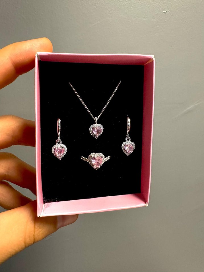 Pembe kalp taşlı kolye, küpe ve yüzükten oluşan kadın takı seti. Parlak detaylarla modern klasik tasarım, romantik anlar için uygun.