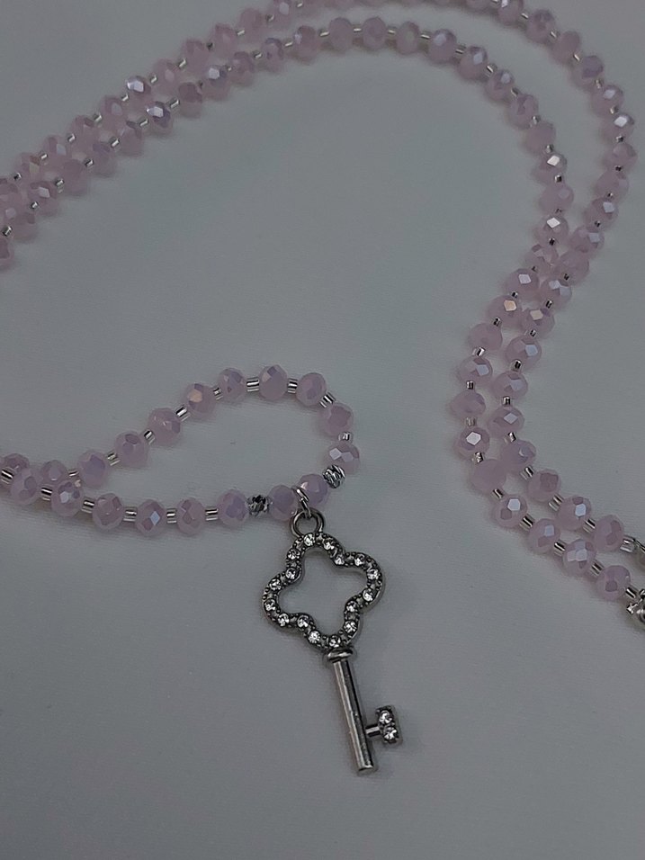 Ürün Sıfırdır.Cam pembe kristal boncuklardan, cam kum boncuklardan ve taşlı methal kolye ucu ile tasarlanmıştır.Siyah bomber ceketlerinizin üzerine takabilirsiniz çok şık durur.