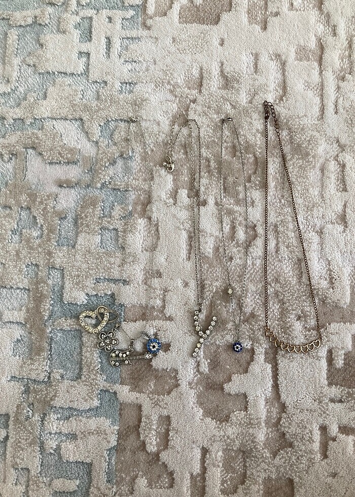 İlk görselde 1 zincir 4 kolye ucu mevcut değişik değişik kullanılabilir. + 3 kolye daha toplu fiyattır (Sadece en sağdaki birçok kalpten oluşan kolyede hafif bir yerinde kararma mevcut diğerleri sorunsuzdur)