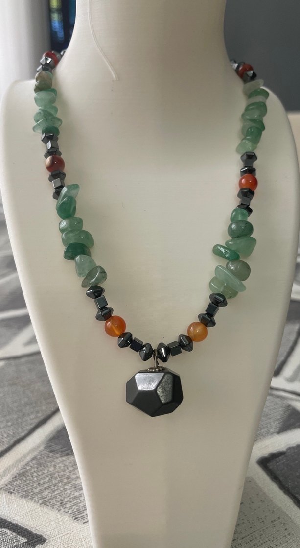 Kolye ucunda doğaltaş Hematit taş bulunmakta. Kolye Aventurin, Akik, Hematit tasarım kolye. çok renkli taşlardan oluşan desenli boncuklu kolye. Koyu renk geometrik bir kolye ucu içerir, bohem tarzına uygundur. Kolye uzunluğu 41,5 cm dir