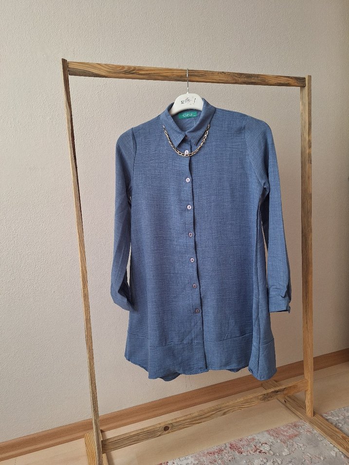 Ürün sıfırdır. S/M beden olup mavi renge sahiptir. Önü ve arkası düğmeli kolyeli modele sahiptir. Kumaşı ketendir. Tunik boy 77 cm'dir. İki koltuk arası 51 cm'dir. Alıcısına hayırlı olsun