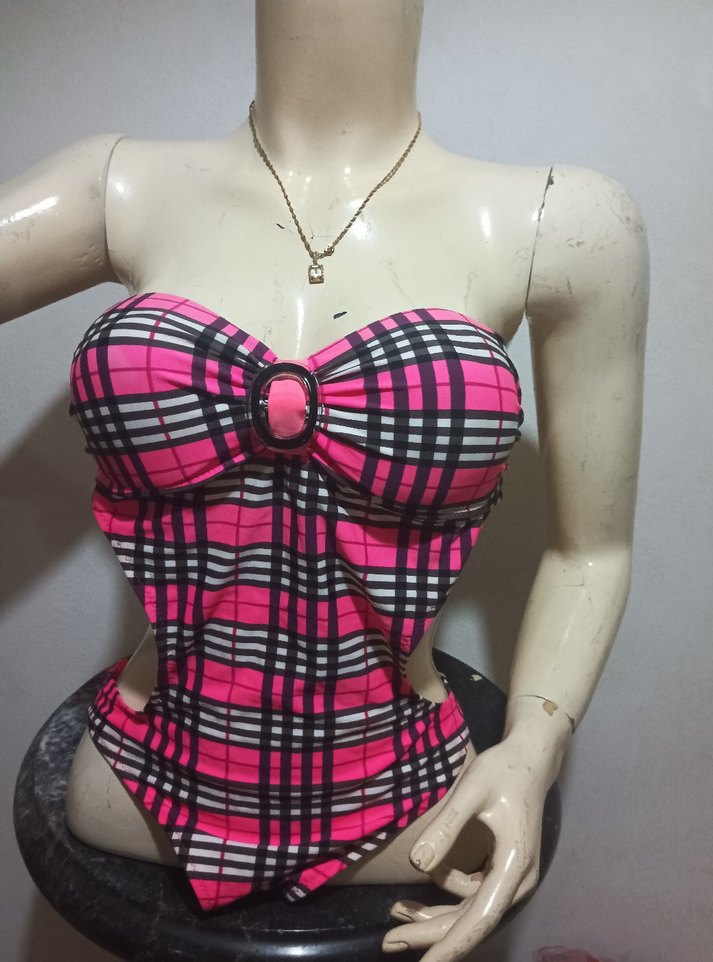 Kom 42 beden Pembe ve renkli bağlamalı desenli, düğmeli detaylı, straplez mini mayo, pedlı sık yeni
