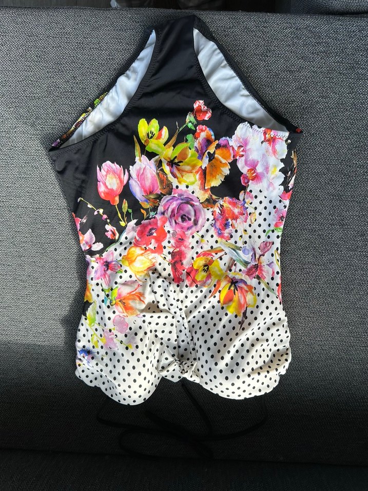 Kolsuz, vücuda oturan bu kadın mayosu, çiçek desenleri ve puantiyelerle hareketlendirilmiş